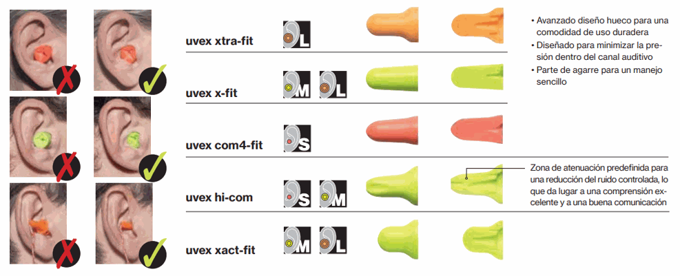 Lo mejor siempre es probarse dos tamaños. UVEX ofrece una gama completa en tres tamaños y con los modelos com4-fit y  x-fit consiguen cubrir la mayoría de canales auditivos.